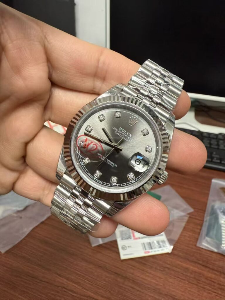 VS Factory’s latest gray Datejust with diamond markers uses moissanite stones, which exhibit almost identical brilliance to real diamonds. Unlike cubic zirconia, moissanite offers genuine fire dispersion — a slight rainbow shimmer under direct light.