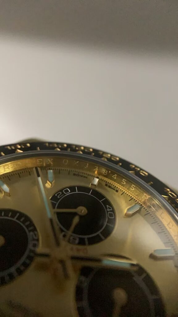 The dial is where the AR Factory truly flexes its technical mastery. This Replica Rolex Daytona Yellow Gold features a champagne sunburst dial with perfectly applied subdials and crisp printing. Under magnification, you’ll notice no ink bleeding or misalignment — a flaw that’s often seen on cheaper replicas. The hour markers are meticulously polished, with clean luminous filling that emits a soft blue glow in dark conditions.